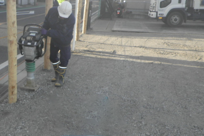 建物基礎や駐車場などで砕石を均一な厚みで敷き、ローラーなどで締め固めて平らで安定した地盤を作る工事です。